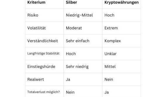 Silber ist stabil, greifbar und einsteigerfreundlich. Krypto ist chancenreich, aber riskant und technisch anspruchsvoll.