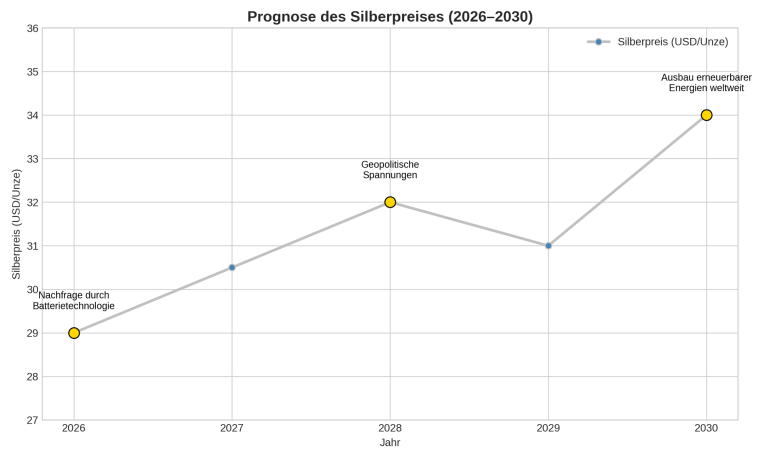 Silberpreis von 2026 bis 2030 – sie zeigt einen moderaten Aufwärtstrend mit drei markierten Ereignissen, die den Markt voraussichtlich beeinflussen könnten: