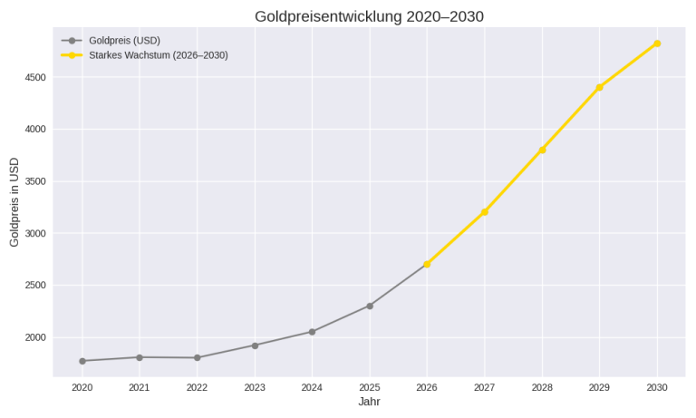 - 2026–2030: Starke Wachstumsphase bis rund 4.822 USD, getrieben durch Inflation, geopolitische Unsicherheiten und Angebotsengpässe.